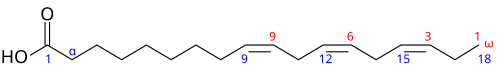 α-리놀렌산(ALA)의 화학 구조는 18개의 탄소 사슬을 가진 지방산으로, 9번, 12번, 15번 탄소에 세 개의  이중 결합이  있습니다. 사슬의 오메가(ω) 말단은 18번 탄소에 위치하고, 오메가 탄소에 가장 가까운 이중 결합은 15번 탄소(=18−3)에서 시작합니다. 따라서 ALA는 ω = 18인  ω−  3 지방산 입니다 .