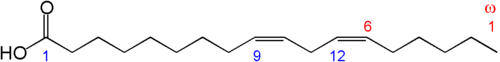 많은  견과류 ,  씨앗  및  식물성 기름 에서 발견되는 일반적인 오메가-6 지방산인  리놀레산 의  화학 구조 . 출처: Wikipedia, "Omega−3 fatty acid", EPA, DHA,"Omega−6 fatty acid", CC BY-SA 4.0